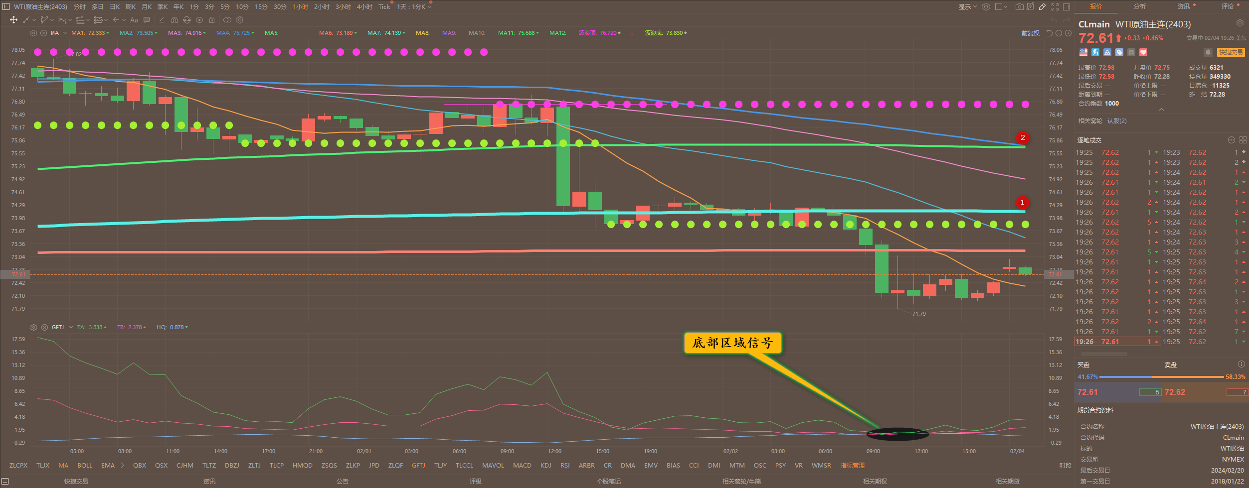 通过对原油小时图解析得知,上一个交易日盘中反弹无力继续延续下跌走势晚间在下方71.80一线止跌反弹,今日早盘受外围数据影响跳空高开一部分,我们从下方的附图可以清楚的看到中短长期筹码已经再次出现黏合迹象说明短期已经到达底部区域,在下方出现触底反弹的可能性更大一点,短期上方我们重点关注,12号均线的压力,下方我们重点关注71.80和70.20一线的支撑,短期在操作上我们继续高空低多,具体建议如下: