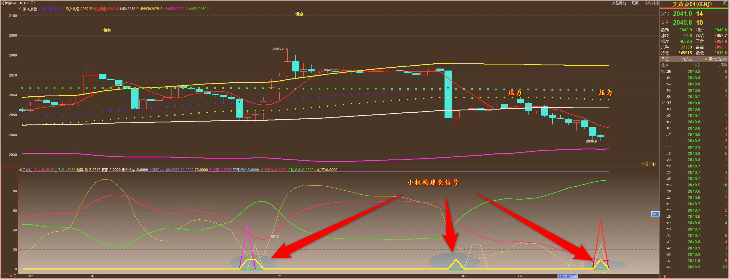 通过对黄金小时图解析得知,黄金从早盘在上方双轨压力位受制冲高回落,我们从下方的附图可以清楚的看到星期五晚间在下方2028一线出现了小机构介入信号,今日早盘小幅反弹了一波,目前在下方2020一线再次出现小机构建仓信号相对而言也是要反弹一波,短期我们继续关注上方双轨的压制2042一线,短期下方我们继续关注下方2017一线的支撑,操作上我们继续高空低多思路,具体建议如下: