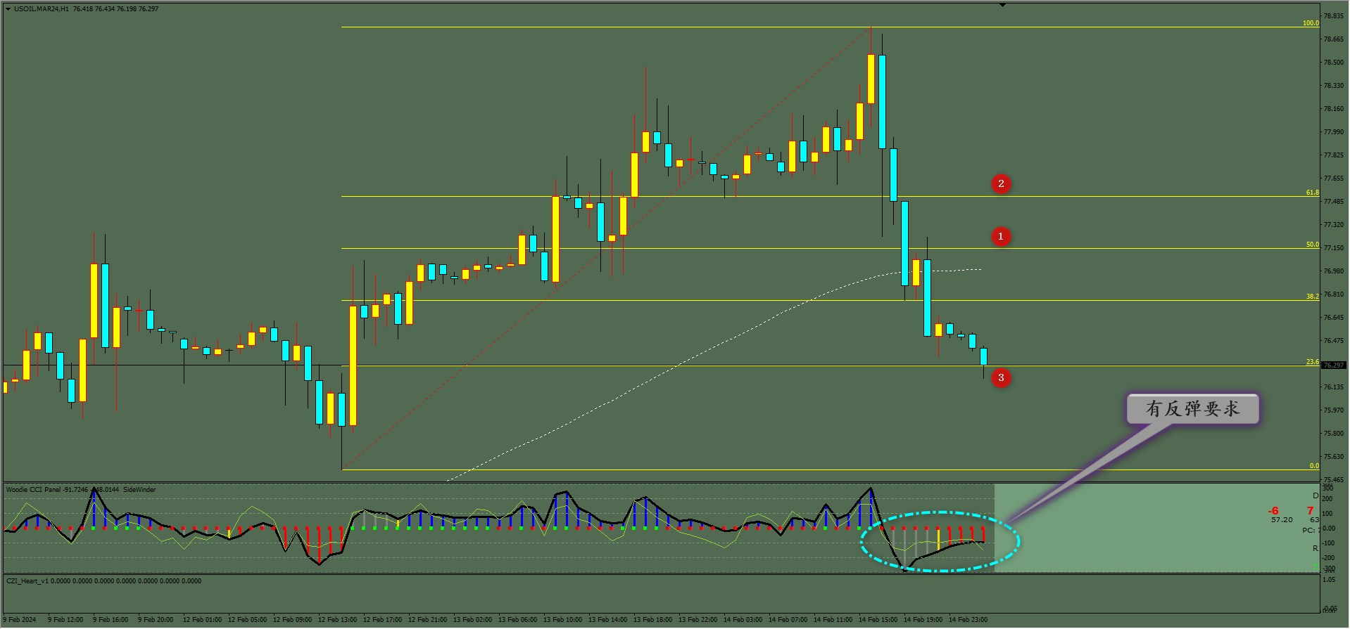 通过对原油小时图解析得知,昨日行情先涨后跌盘整一度到达上方78.70一线冲高回落,到目前为止依然回落调整中,目前已经到达下方黄金分割位的3号支撑位相对而言也是有所支撑,我们从下方的附图可以清楚的看到CCI有进一步向上运行的可能性并且走强迹象,短期上方我们重点关注1,2号的黄金分割位的压制,短期在操作上我没继续高空低多思路,具体建议如下: