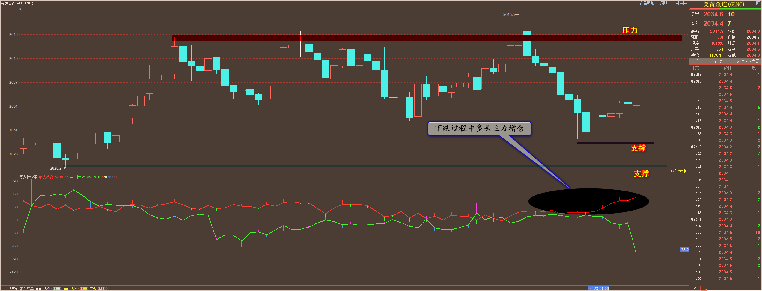 通过对黄金小时图解析得知,昨日行情如期冲高回落,虽然盘中进一步创新高但是依然是在2033-3038这个区间的重压之下运行,晚间一度到达下方2019一线目前止跌反弹,之所以会出现止跌反弹动作,我们从下方的附图可以清楚的看到行情在2020一线出现多头主力增仓的动作,目前依然大幅增仓,短期上方我们继续关注2033一线的压制,短期下方我们重点关注2017的支撑,短期在操作上我们继续高空低多思路,具体建议如下: