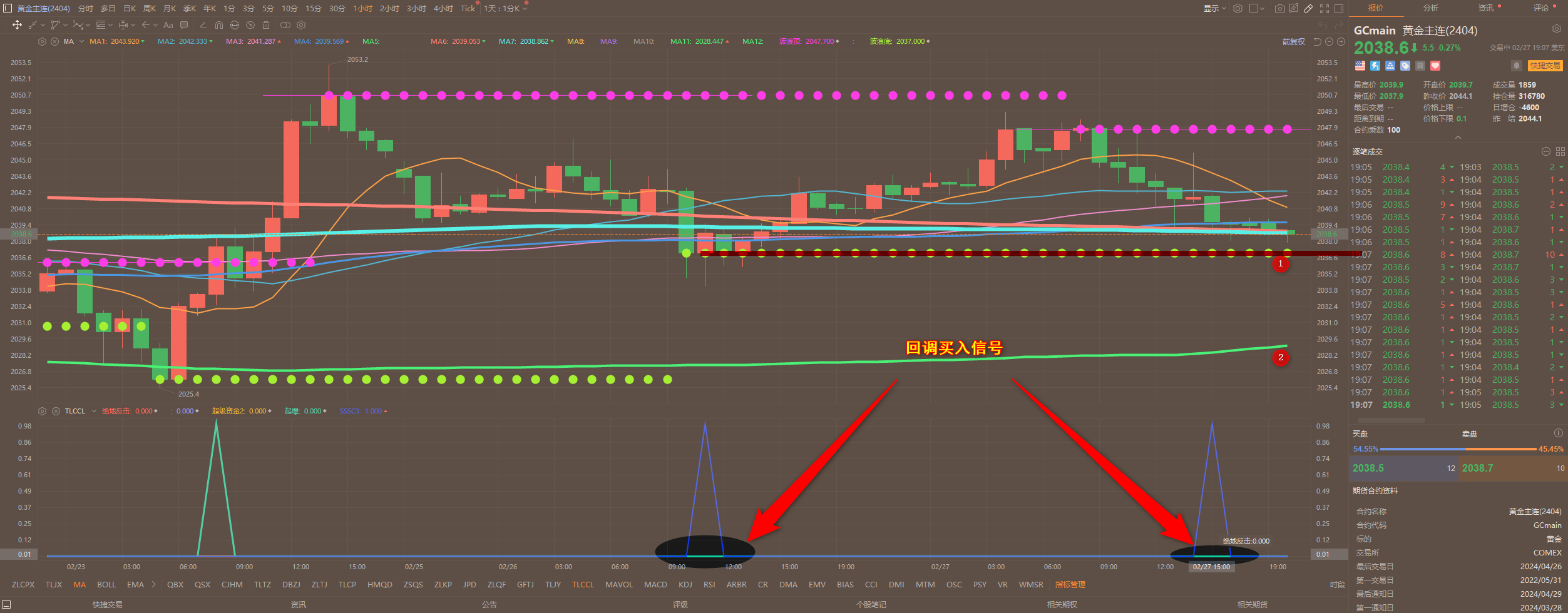 通过对黄金小时图解析得知,昨日行情先涨后跌再盘中再次形成窄幅震荡走势,目前即将到到达下方1号支撑位(2027一线),我们从下方的附图可以清楚的看到已经再次出现回调买入信号,在前几日出现回调买入信号的时候行情反弹上涨了一波,今日再次出现预计将会继续反弹上涨一波短期上方我们重点关注2042一线的压制,下方我们重点关注12号的支撑,在操作上我们继续高空低多思路,下来了继续重点逢低做多,具体建议如下: