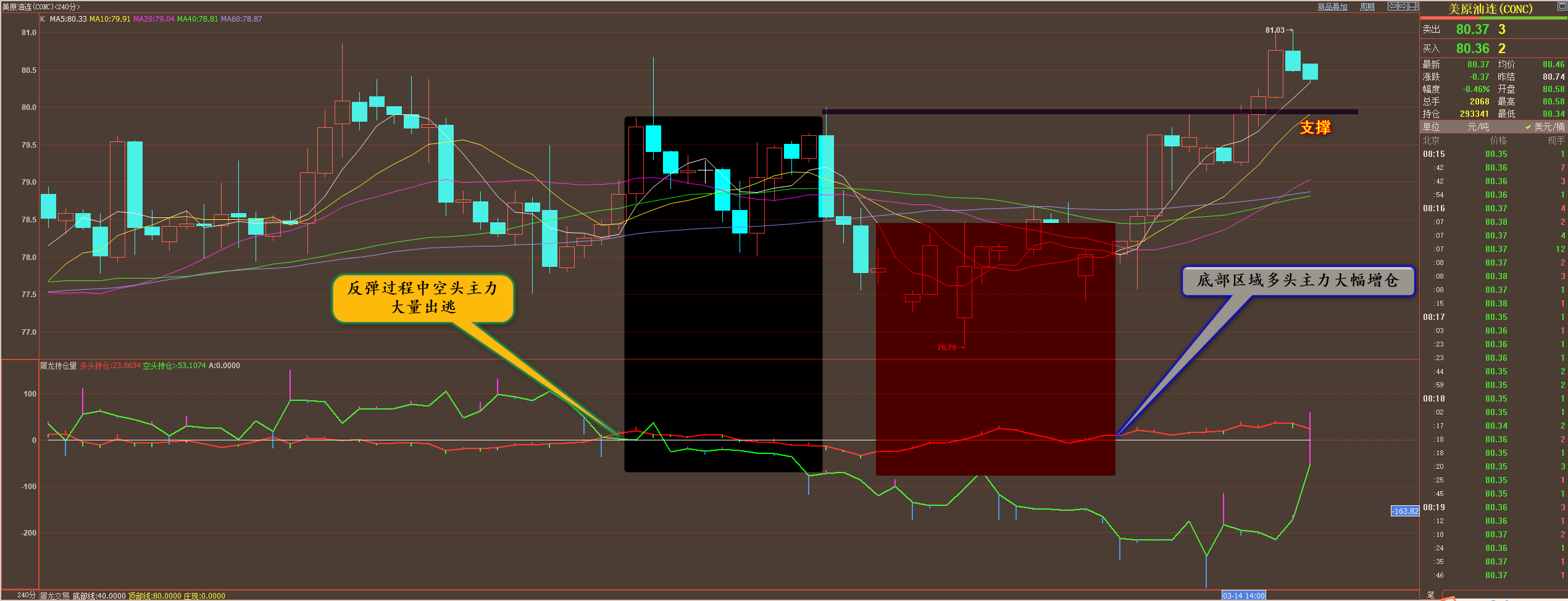 通过对原油4小时图解析得知,昨日行情如期延续上涨行情依据突破前期的高点,回归上涨走势,行情在前期小妹之所以会认为要上涨,我们从下方的附图可以清楚的看到在上一波反弹的过程中空头主力大量的出逃,而在底部区域我们可以清楚的看到多头主力持续几天的增仓从而导致行情的拉升突破并且脱离底部区域,短期前期的高点已经反过来成为支撑,短期在操作上我们继续重点逢低做多思路不变,具体建议如下: