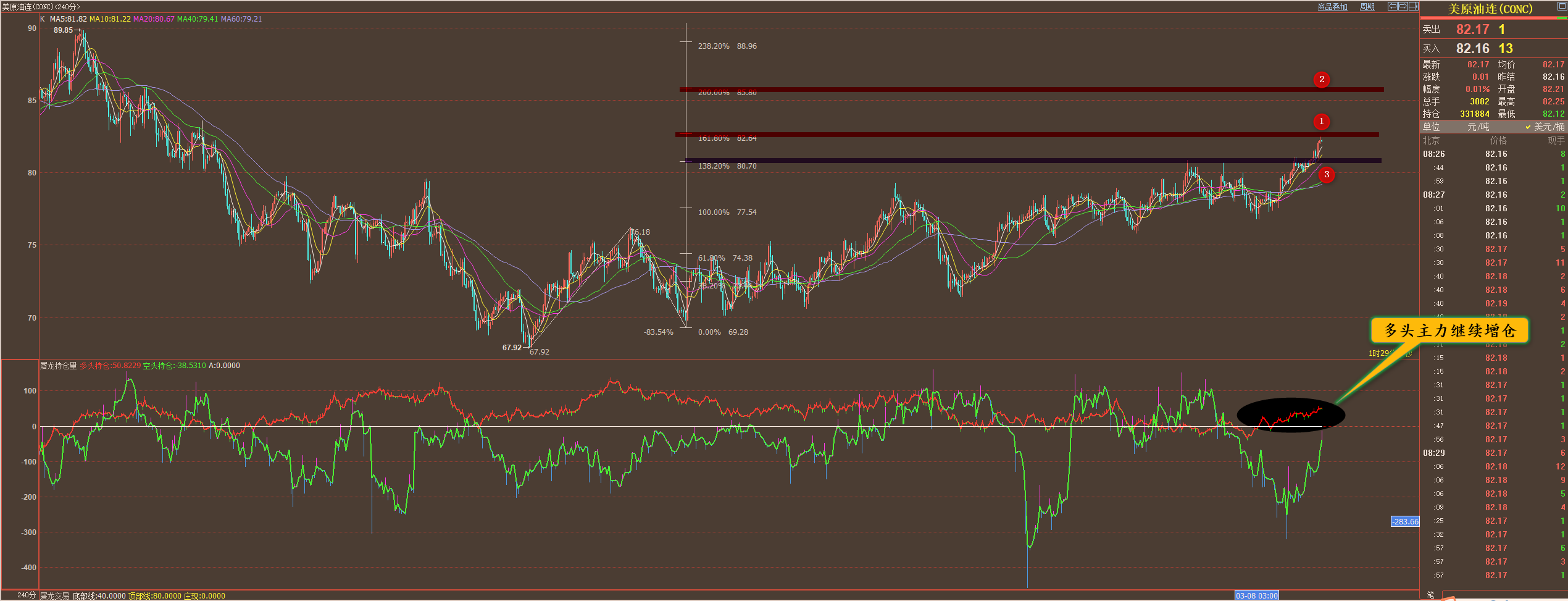 通过对原油4小时图解析得知,昨日行情先跌后涨如期突破创新高,即将到达上方1号压力位,我们从下方的附图可以清楚的看到近期2个星期多头主力一直是处于增仓的状态从而导致行情不断的突破创新高,短期下方3号支撑位已经成为短期的强支撑(80.70一线),短期有进一步向上突破的可能性上方我们重点关注2号压力位(85.80一线),在前期在底部区域震荡筑底的时候就已经多次强调超级主力在底部区域大量建仓目前整体已经脱离底部区域,一旦后期有深度调整下方箱体的上沿已经成为最强支撑(76.00样子),短期在操作上我们继续逢低做多思路不变,具体建议如下: