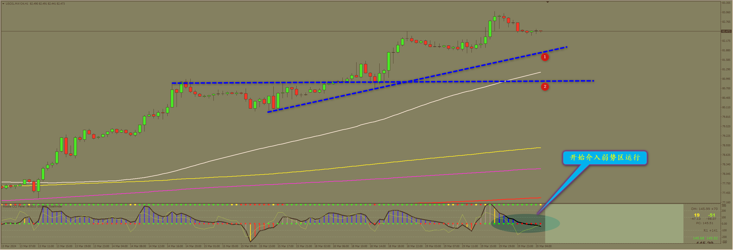 通过对原油小时图解析得知,昨日行情先跌后涨再下跌,继续突破创新高,短期继续沿着1号上升趋势线震荡上行,但是不排除进一步回落调整到达下方2号支撑位,我们从下方的附图我们可以清楚的看到CCI开始向零轴下方运行说明短期将会继续调整一下,短期整体大方向依然上涨不变,短期上方我们重点关注前期反弹高点的压力位,预计有一波调整的可能性,短期在操作上我们继续高空低多思路重点逢低做多,具体建议如下: