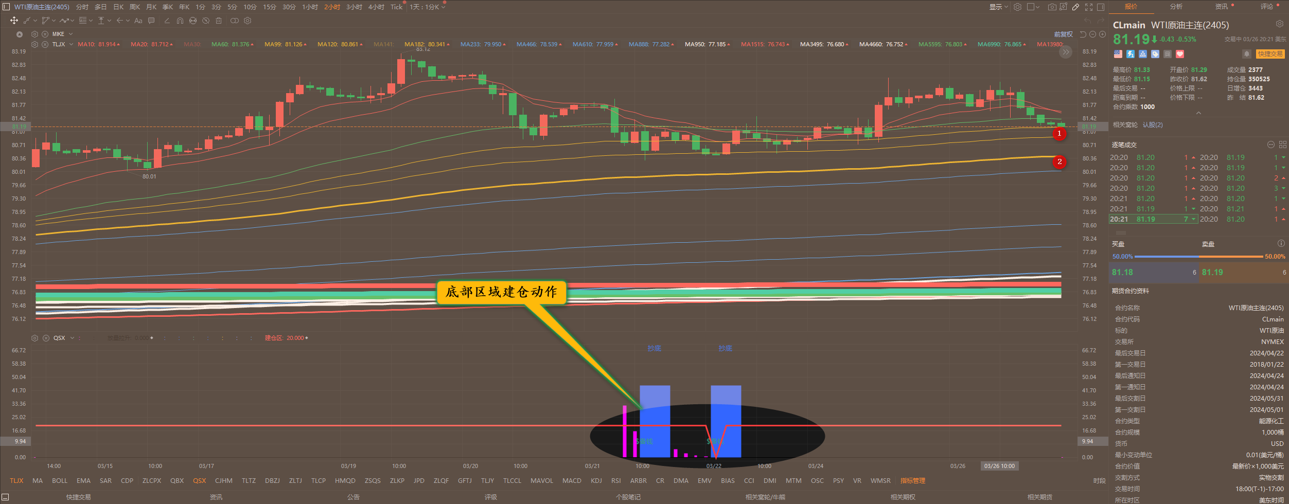 通过对原油2小时图解析得知,昨日行情先涨后跌,在上方82.30一线冲高回落,目前已经到达下方1号均线的支撑位,同时也是前期反弹的高点位置,相对而言有一定的支撑作用,我们从下方的附图可以清楚地看到在近期回调的底部区域80.30一线连续出现了多头主力抄底的信号,虽然目前已经到达1号支撑位,但是不排除再次回调到下方2号支撑位(80.40一线)前期的多头主力建仓的位置,短期在操作上我们继续重点逢低做多思路不变,具体建议如下: