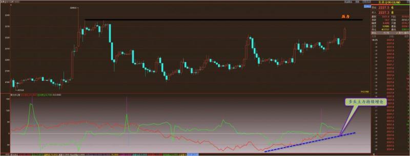 通过对黄金小时图解析得知,黄金从干燥盘到目前为止如期放量突破一号压力位目前已经接近上方的早盘所说的2号压力位2212一线,我们从下方的附图可以清楚的看到多头主力已经连续2天持续缓慢的增仓介入,目前已经有走强迹象,短期我们重点关注上方2212一线的关键压力位,一旦突破将会再次到达上方2223一线,短期早盘下方2199一线已经成为短期的支撑,在操作上我们可以反过来继续做多,具体建议如下: