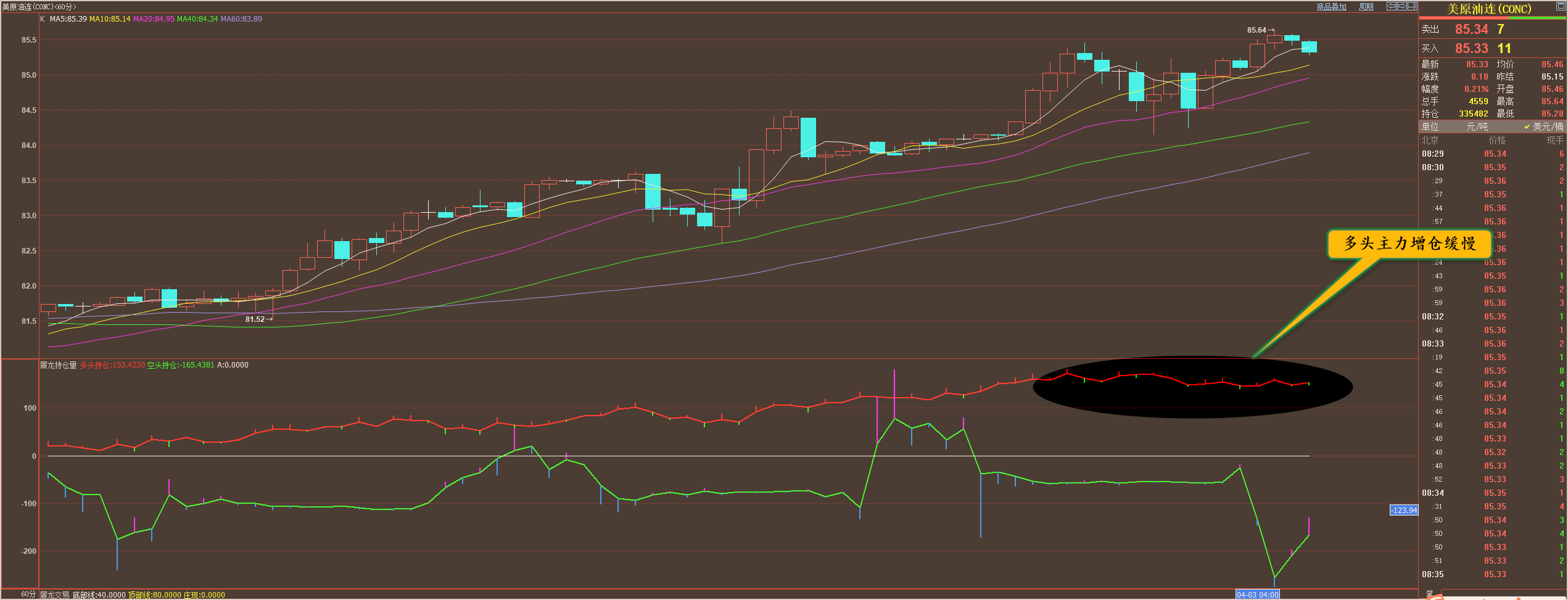 通过对原油小时图解析得知,昨日行情先跌后涨继续延续上涨突破走势,我们从下方的附图可以清楚地看到多头主力依然占优基本上是处于持平的状态还有些减仓动作,行情之所以会继续向上突破主要是空头主力大量出逃导致属于被动式上涨,短期多头主力有获利了结迹象,势头有些减缓,盘中警惕受数据影响冲高回落,在操作上我们继续高空低多思路,重点逢低做多不变,具体建议如下: