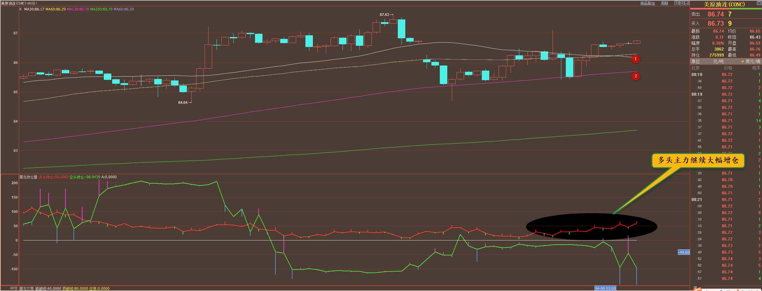 通过对原油小时图解析得知,昨日行情先跌后涨,在盘中形成宽幅震荡调整走势整体依托均线系统震荡上行,我们从下方的附图可以清楚的看到多头主力继续大幅增仓介入,昨日晚间在盘中形成上下引线对后期行情进一步上涨做好准备,短期将会继续沿着均线系统震荡上行,我们重点关注下方12号均线即可,在操作上我们继续重点逢低做多,具体建议如下:
