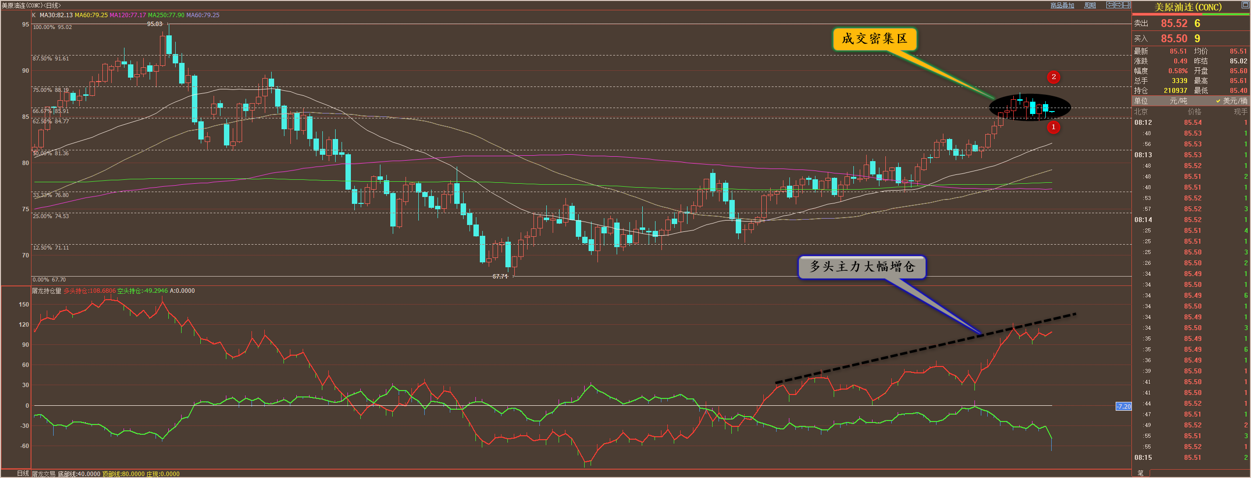 通过对原油日线图解析得知,昨日行情先跌后涨,连续6个交易日在高位震荡调整运行,近期之所以会出现调整是已经到达前期的成交密集区相对而言有一些压力,我们从下方的附图可以清楚的看到行情从底部开始多头主力大幅增仓介入以及在横盘震荡期间依然保持增仓动作主要是带动行情的上涨动力源,短期我们重点关注下方1号支撑位(84.80一线),上方我们重点关注2号压力位(88.20一线)一旦放量突破将会到达上方90.00一线,在操作上我们继续重点逢低做多,具体建议如下: