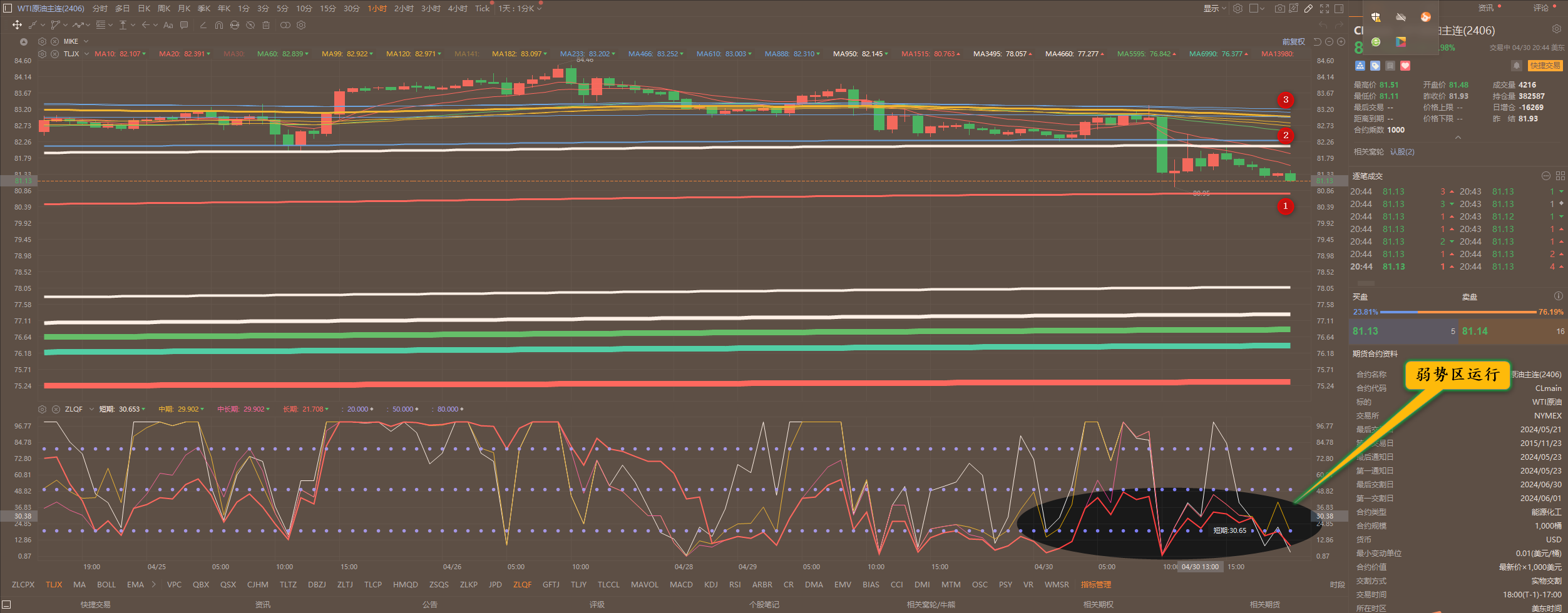 通过对原油小时图解析得知,昨日行情反弹无力继续回落调整,之所以会反弹无力我们从下方的附图可以清楚的看到多头主力已经进入弱势区运行并且持续低迷,非常有可能进一步的回落调整,短期重点我们关注下方1号均线的支撑,上方23号均线压力已经成为短期重要阻力位,在操作上我们继续高空低多思路,具体建议如下: