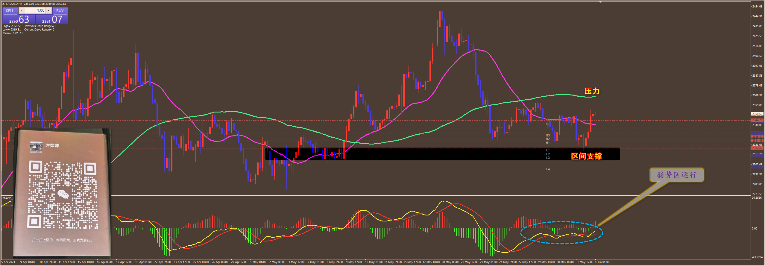 通过对黄金4小时图解析得知,昨日行情如期到达下方2315-2305这个区间支撑得到多头主力的关照一路反弹上涨,基本上快要把星期五的下跌收复回来,在盘中形成了宽幅震荡调整走势,但是短期整体行情依然是在弱势区盘整当中运行,我们可以从下方的MACD可以清楚的看到依然是在零轴下方运行整体属于弱势反弹走势,但是不排除进一步反弹到达上方均线的压力位,短期在操作上我们继续高空低多思路,具体建议如下: