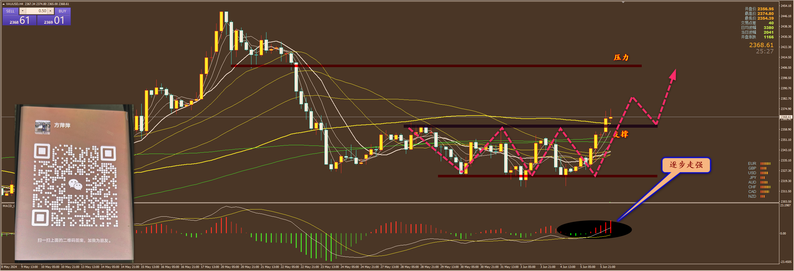 通过对黄金小时图解析得知,昨日行情先涨后跌再上涨并且回到箱体的支撑位继续向上突破,短期我们重点关注上方趋势线的压力以及上方12号的黄金分割线的压力,短期已经形成了上升节奏,在操作上我们继续重点逢低做多思路不变,今晚非农行情上下波动比较大一点,我们继续重点关注下方箱体的支撑,除非是利空行情暴跌打破箱