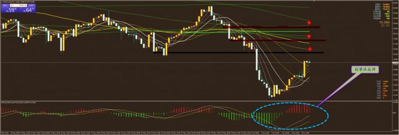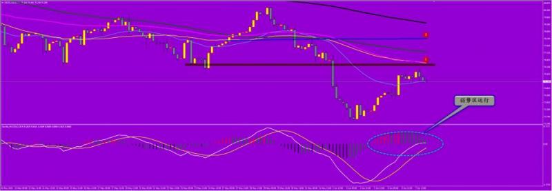 通过对原油小时图解析得知,上一个交易日超跌反弹到达上方76.20一线冲高回落,自从上周四一路回落以来连续跌破下方支撑,短期已经处于空头趋势当中,我们从下方的ACD也可以清楚的看到短期整体在零轴下方运行短期属于弱势反弹走势,但是不排除进一步反弹到达上方12号均线的压力位,短期在操作上我们继续重点逢高做空具体