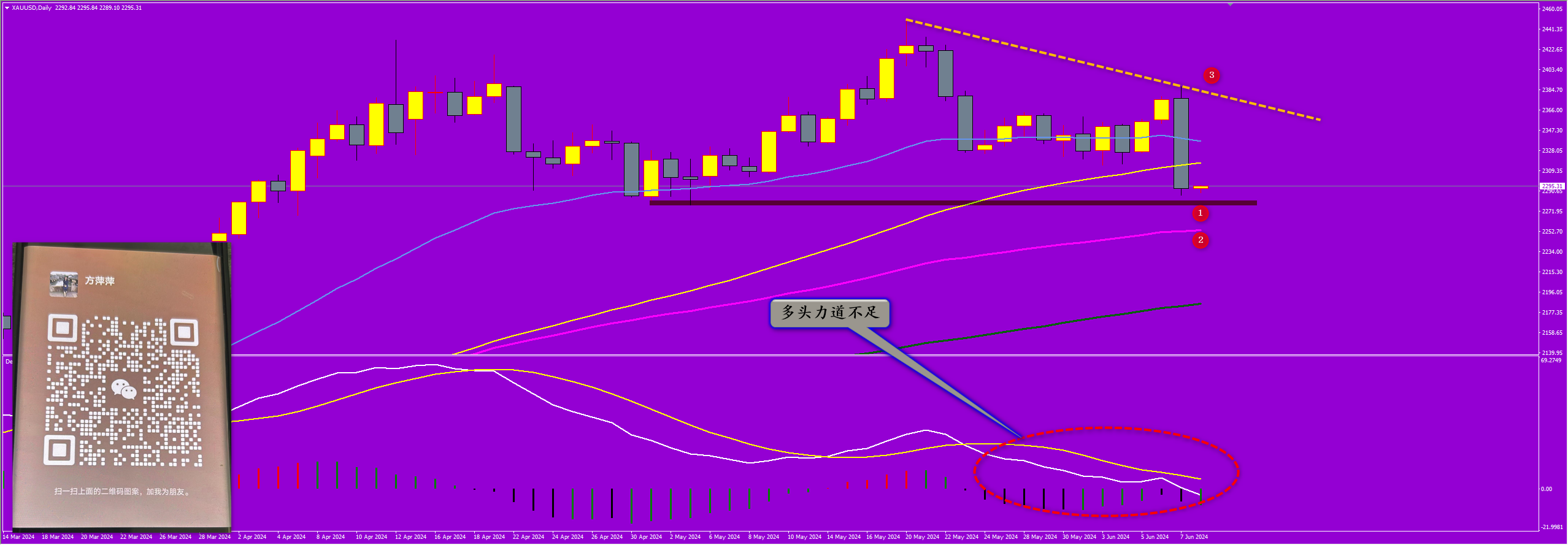 通过对黄金日线图解析得知,上一个交易日先涨后跌一根阴线打破近期的反弹走势,我们从下方的幅图ACD也可以清楚的看到上周在反弹的过程中虽然下跌的绿色能量柱有所缩短,但是多头主力的力道不足目前有进一步下探的风险同时已经接近前期的超级主力抄底的位置不排除先反弹一波在下跌,目前短期上方3号下降趋势线的压力已经