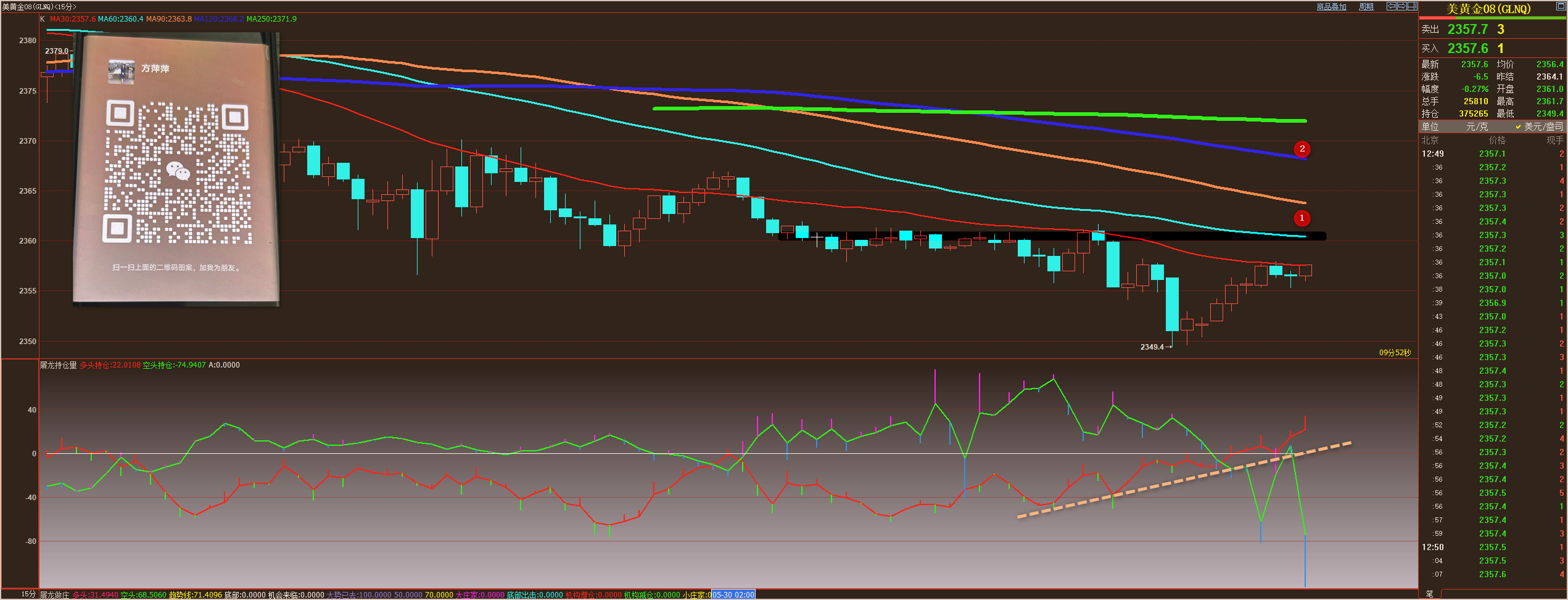 通过对黄金15分钟图解析得知,黄金从早盘到目前为止反弹无力继续向下运行,目前有所反弹,行情之所以会出现反弹动作,我们从下方的幅图可以清楚的看到早盘在下跌的过程中出现了多头主力增仓动作,短期我们重点关注上方12号的均线压力2341和2347一线的样子,短期依然处于下跌的过程中目前只是属于反弹动作,短期我们重点