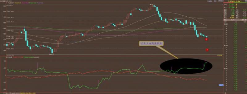 通过对原油小时图解析得知,昨日行情盘中反弹无力继续回落调整,行情之所以会回落调整,我们从下方的附图就可以清楚的看到行情到达高位之后出现了多头主力大量出逃,并且空头主力高度控盘从而形成行情的一路回落调整,短期已经到达百分比的支撑位(1号支撑)相对而言也是有一定的支撑作用但是不排除进一步下探到2号支撑