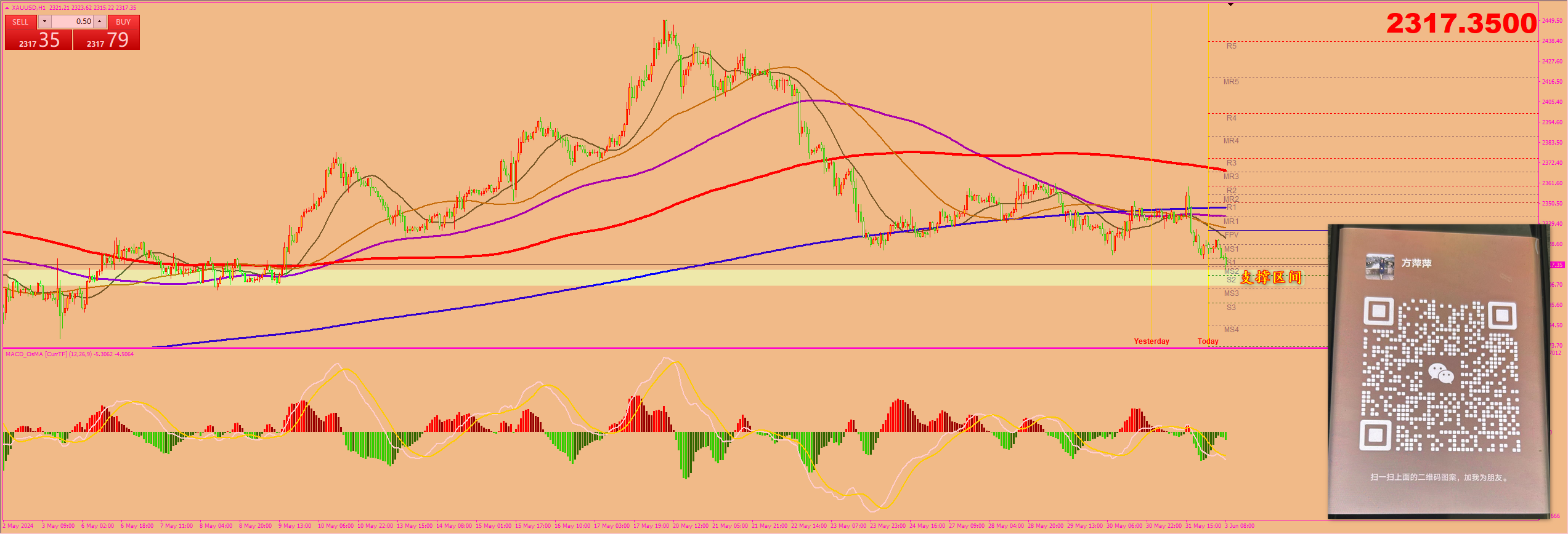 通过对黄金小时图解析得知,黄金从早盘反弹到上方2331附近冲高回落,目前已经到达下方支撑区间(2315-2305),相对而言会有一些抵抗性资金进仓,短期虽然下方ACD绿色下跌动能柱有所缩短出现底背离迹象,但是短期依然是在零轴下方运行,还没有明显的止跌迹象,短期我们还需要进一步多观察一下,短期上方2331一线已经成为