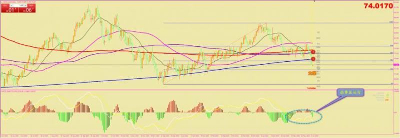 通过对原油日线图解析得知,昨日行情反弹无力继续延续下跌走势,目前在74附近震荡徘徊,昨日一举跌破近期低点的支撑相对而言还有惯性下跌动作,短期我们重点关注下方23.6%一线的黄金分割率的支撑,以及下方周线级别的强支撑,我们从下方的幅图ACD也可以清楚的看到近期一直是在零轴下方运行反弹力道明显不足,短期在操作