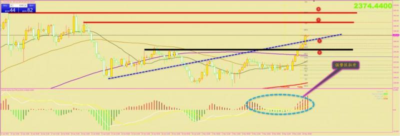 通过对黄金小时图解析得知,上一个交易日黄金先涨后跌如期到达上方2378一线冲高回落,目前即将到达下方20日均线的支撑位(2358一线),相对而言有一定的支撑作用。我们从下方的附图可以清楚的看到自从在底部区域出现多头主力建仓信号行情一路震荡上行突破,目前有所回落调整不排除进一步深度调整到达下方2330一线的强支