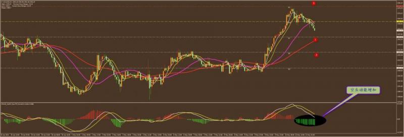 通过对黄金小时图解析得知,昨日行情继续延续回落调整走势,晚间到达下方1号均线的位置止跌,我们从下方的附图可以清楚地看到从高未开始回落调整市场资金流开始处于出逃的迹象,从而导致行情一路的调整。晚间到达下方1号均线的位置出现资金介入的迹象,但是不排除进一步下探到下方2号均线的支撑整体符合我们的预期走势多