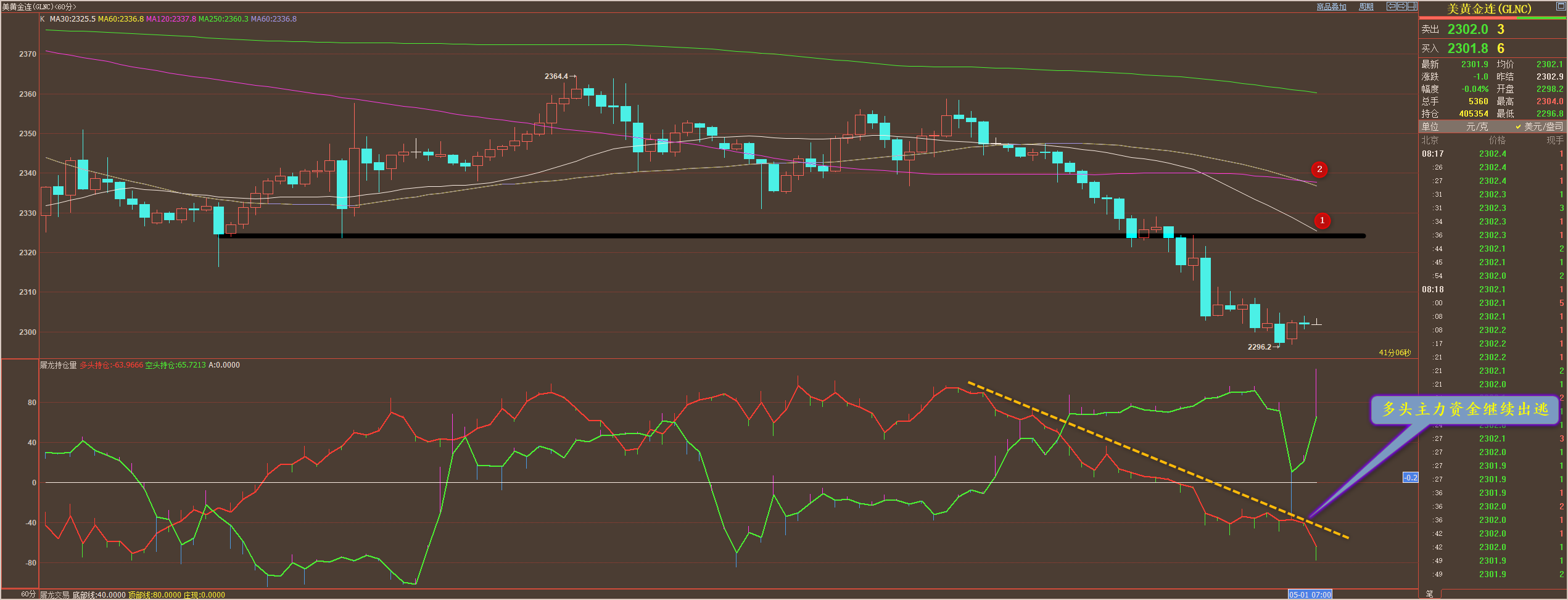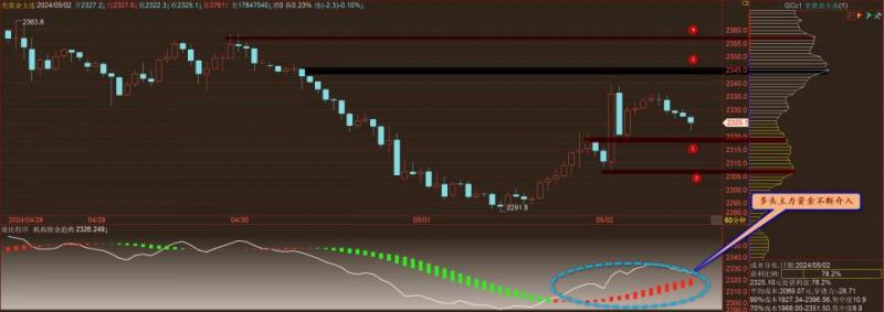 通过对黄金小时图解析得知,黄金从早盘冲高回落目前到达下方2312一线即将接近1号筹码峰值的支撑位,我们从下方的幅图可以清楚的看到,昨日为什么会出现反弹在底部区域出现了多头主力资金不断的介入迹象,从而导致行情进一步的反弹,目前行情虽然有继续回落调整动作,但是多头主力资金依然是处于增仓的状态,说明行情回落