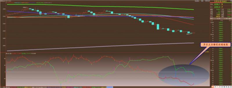 通过对黄金小时图解析得知,黄金从早盘继续向下运行,目前还没有止跌迹象,但是我们从下方的附图可以清楚的看到黄金在回落的过程中多空双方主力都有出逃迹象但是空头主力依然占优,说明短期市场双都有力量衰竭迹象到目前为止多头主力还没有进仓动作,预计要回到2260*2280这个区间当中运行,短期在操作上暂且逢高做空,一