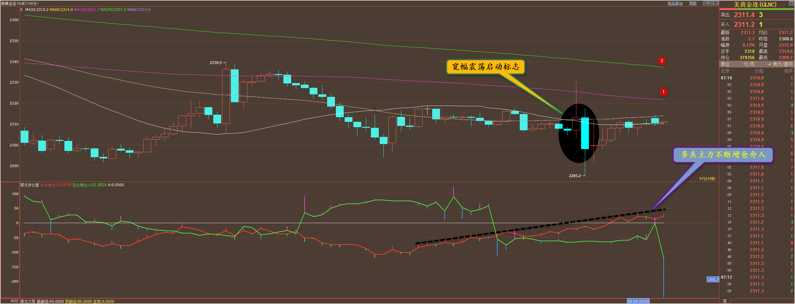 通过对黄金2小时图解析得知,黄金从早盘先跌后涨目前有所反弹,短期目前如期在下方震荡调整运行,目前还不具备翻转一说还需要继续震荡筑底,我们从下方的附图可以清楚的看到下午盘中出现了底部多头主力建仓信号,在上一波2291一线出现行情反弹了一波,目前再次出现预计将会继续要反弹一波短期上方我们重点关注2312一线的