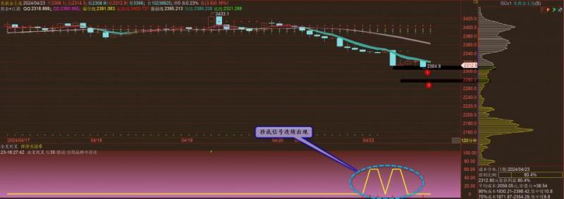 通过对黄金2小时图解析得知,黄金继续延续下跌走势晚间到达下方2291一线(1号支撑位),同时也是右侧筹码峰值的支撑位相对而言也是有一定的支撑作用,我们从下方的附图也可以清楚的看到已经到达底部区域连续出现抄底信号,短期就看在什么位置止跌反弹,个人认为继续震荡调整的可能性比较大,但是不排除进一步下探到达下