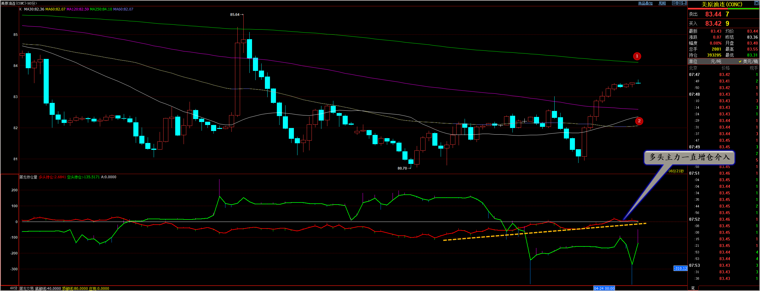 通过对原油小时图解析得知,昨日行情先涨后跌再上涨,在盘中形成宽幅震荡走势,前天就已经说过已经出现了底部启动信号,虽然短期依然受制于均线系统的压制。但是我们从下方的附图可以清楚的看到近2个交易日多头主力一直是处于增仓的状态从而导致行情进一步的反弹上涨。短期上方我们重点关注1号均线的压制,下方我们重点