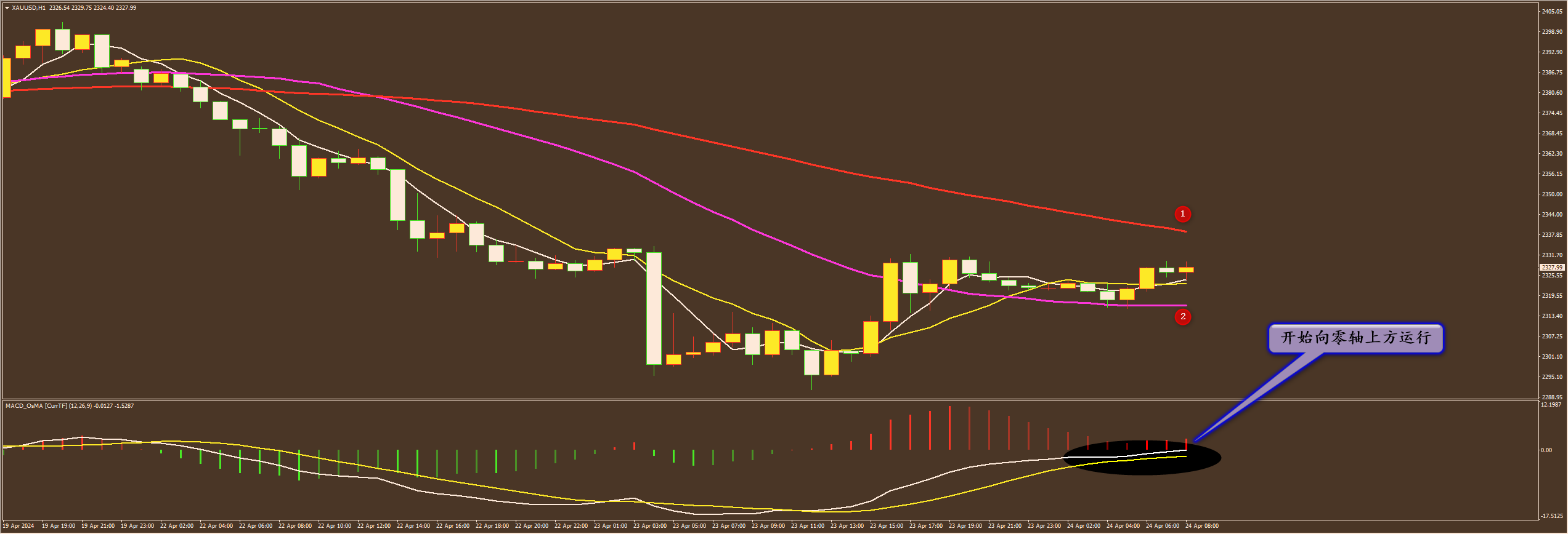 通过对黄金小时图解析得知,黄金从早盘先跌后涨,在下方2号均线支撑位得到支撑小幅反弹,目前即将到达上方1号均线压力位,同时我们从下方是的附图ACD可以清楚的看到已经接近零轴并且有意愿上穿迹象,短期整体均线系统依然处于空头排列预计还要来回震荡调整运行,短期在操作上我们继续高空低多思路,具体建议参考早盘策略