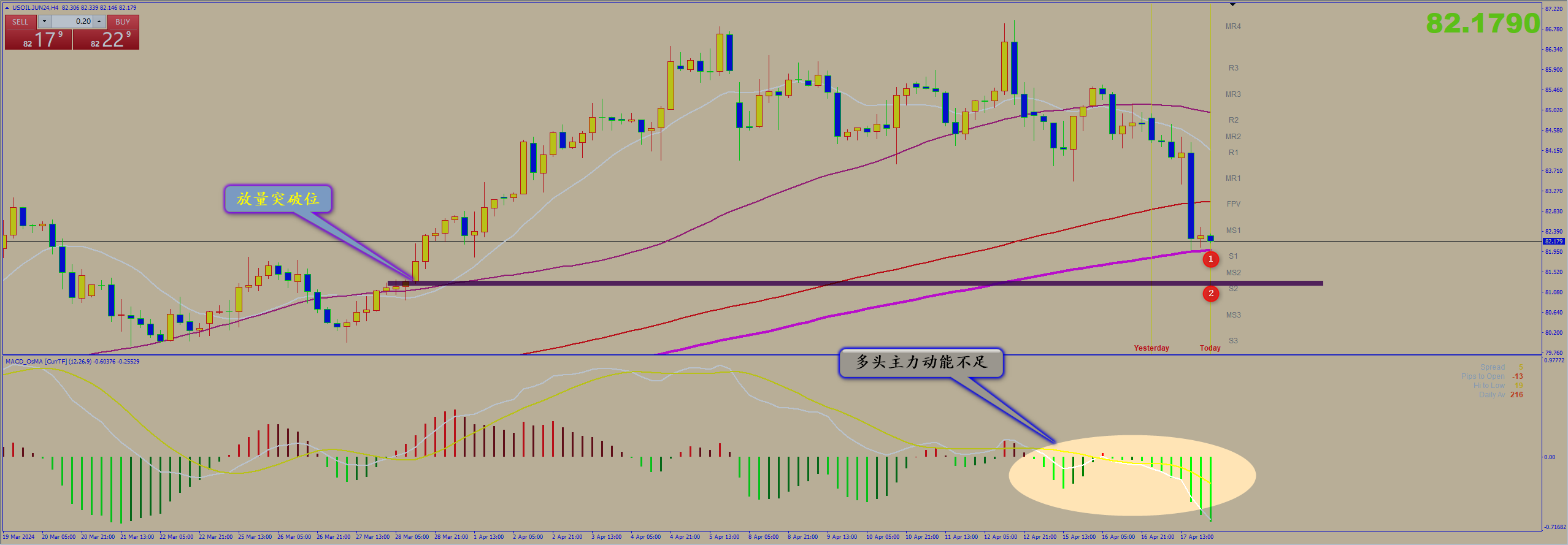 通过对原油4小时图解析得知,昨日行情反弹无力继续延续回落走势,受交割期影响连续两个交易日多头主力节节败退,我们从下方的ACD也可以清楚的看到多头主力的反弹动能有些不足,昨日晚间在下方1号均线的支撑位稍微有所收敛,但是不排除到达前期多头主力启动突破的位置,目前反过来已经成为强有力的支撑,短期上方83.90和8