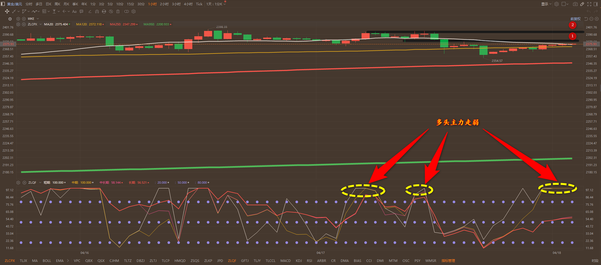 通过对黄金小时图解析得知,黄金从砸盘继续延续反弹走势,目前即将到达上方1号压力位(2379一线),行情之所以会出现冲高回落出早盘所说的多头主力出逃之外,我们从下方的附图也可以清楚的看到在昨日多头主力已经没有力道再次会强势区运行,到目前为止显示更加弱,短期冲高回落的可能性比较大但是不排除受数据影响反弹到