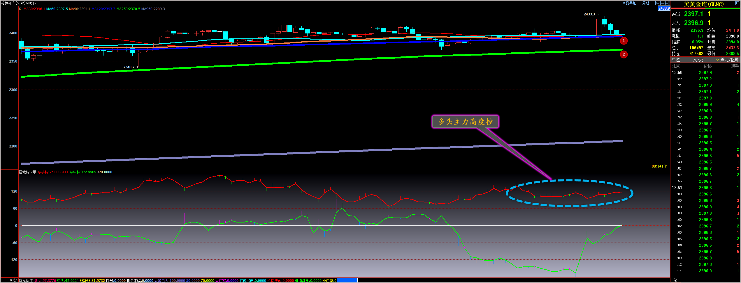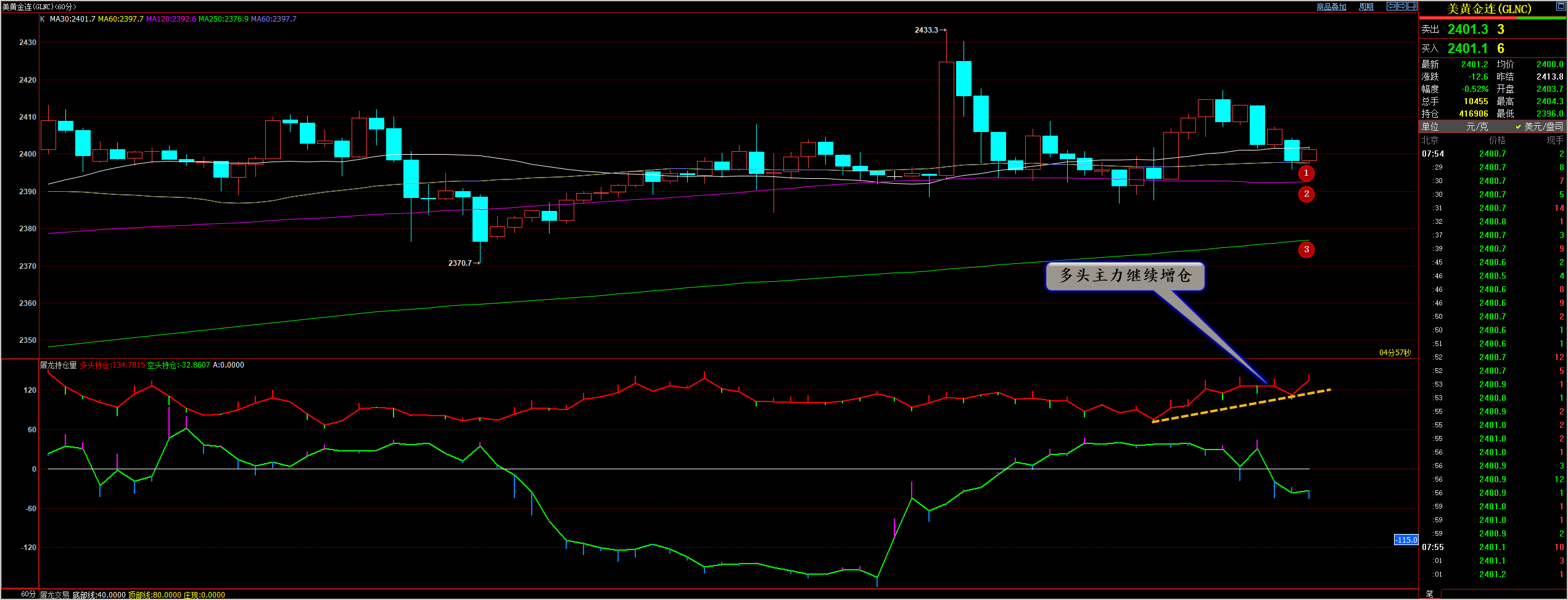 通过对黄金小时图解析得知,早盘黄金冲高回落在上方2418附近受制,目前再次到达下方1号均线的支撑位我们从下方的幅图可以清楚的看到多空主力都有增仓动作,在高位空头主力增仓幅度更加大一点也是冲高回落的主要原因,但是整体多头主力依然控盘占有绝对的优势,早盘就已经说过行情将会继续沿着均线震荡上行突破目标位2430
