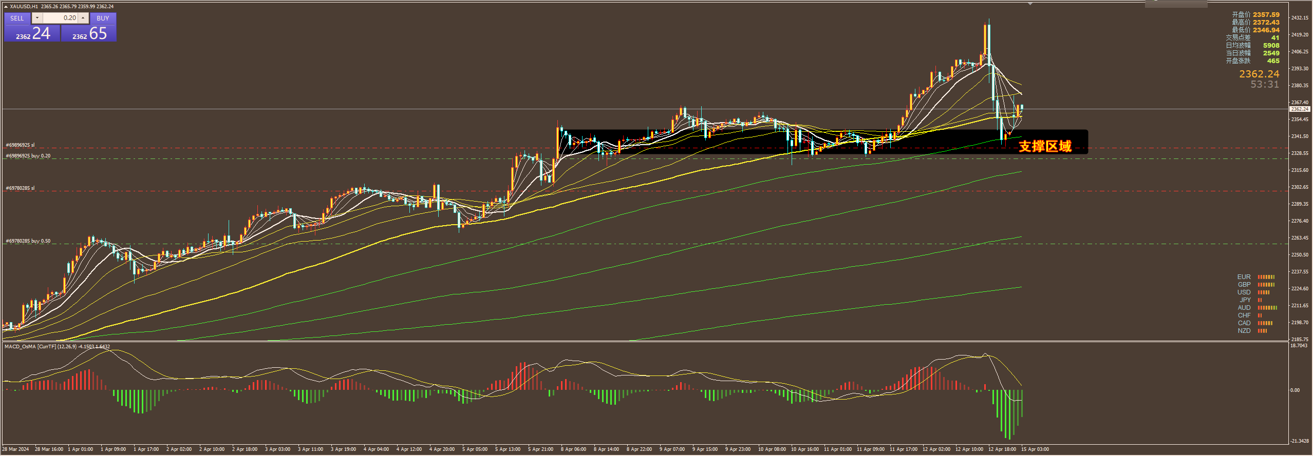 通过对黄金4小时图解析得知,昨日行情先跌后涨如期到达下方2325一线的支撑,同时也是60日均线的支撑位相对而言也是有一定的支撑作用的,我们从下方的附图也可以清楚的看到短期虽然有调整调整幅度也比较大但是整体依然是在零轴上方运行说明整体行情属于强势调整,短期下方行情将会继续依托20日均线震荡上行,在操作上我们