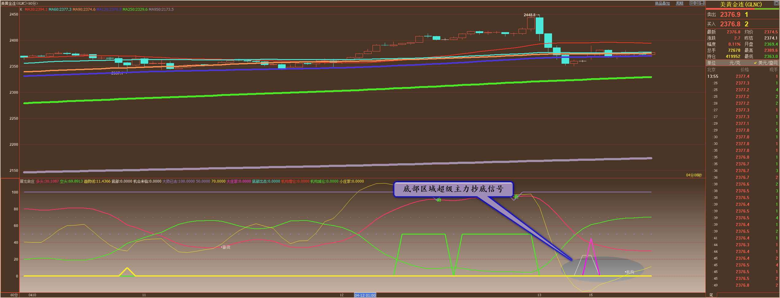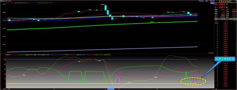 通过对黄金小时图解析得知,黄金从早盘冲高回落,目前到达下方的均线支撑位止跌反弹,我们从下方的附图可以清楚地看到,昨天在下方出现了超级主力抄底信号,小幅反弹了一波,今日在回到下方2363一线出现了大黑庄抄底信号预计美盘时间段行情将会继续向上运行突破2392一线的压力可能性比较大,短期我们继续关注2414和2430