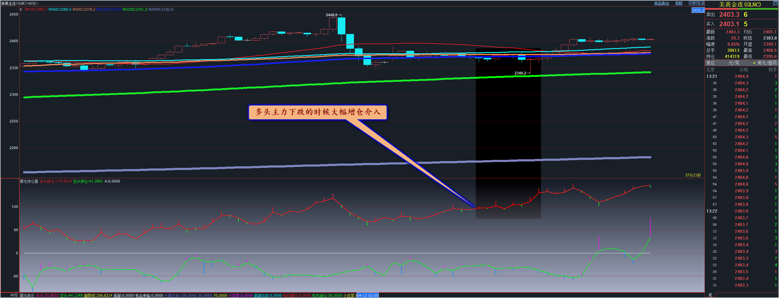 通过对黄金小时图解析得知,黄金从早盘继续延续上行走势,虽然目前在2392一线受阻但是应该是阻挡不了的,我们从下方的附图也可以清楚地看到行情之所以会出现止跌以及上涨都是有内在原因的,在昨日下跌回落调整的时候多头主力大幅增仓介入,在上周五晚间下方2331一线出现了超级主力抄底动作,晚间的下跌属于诱空动作从而