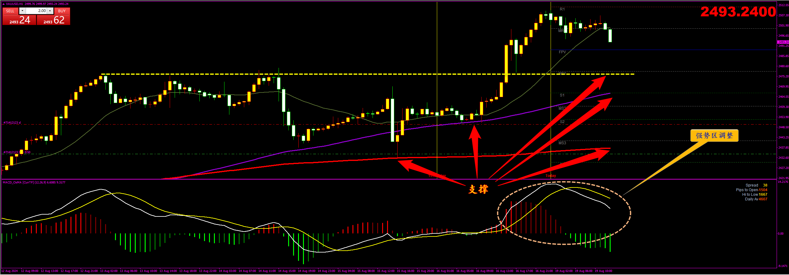 通过对黄金4小时图解析得知,黄金从早盘先涨后跌下午在下方2497一线止跌反弹上涨,纵观全局我们从三张图中我们可以清楚的看到自从多头主力从底部区域启动上涨行情行情一直沿着上升趋势线震荡上行突破,目前已经再次创新高整体多头主力的能量充足并且已经形成阶梯式上涨,但是不排除数据影响回落调整,我们重点关注下方上