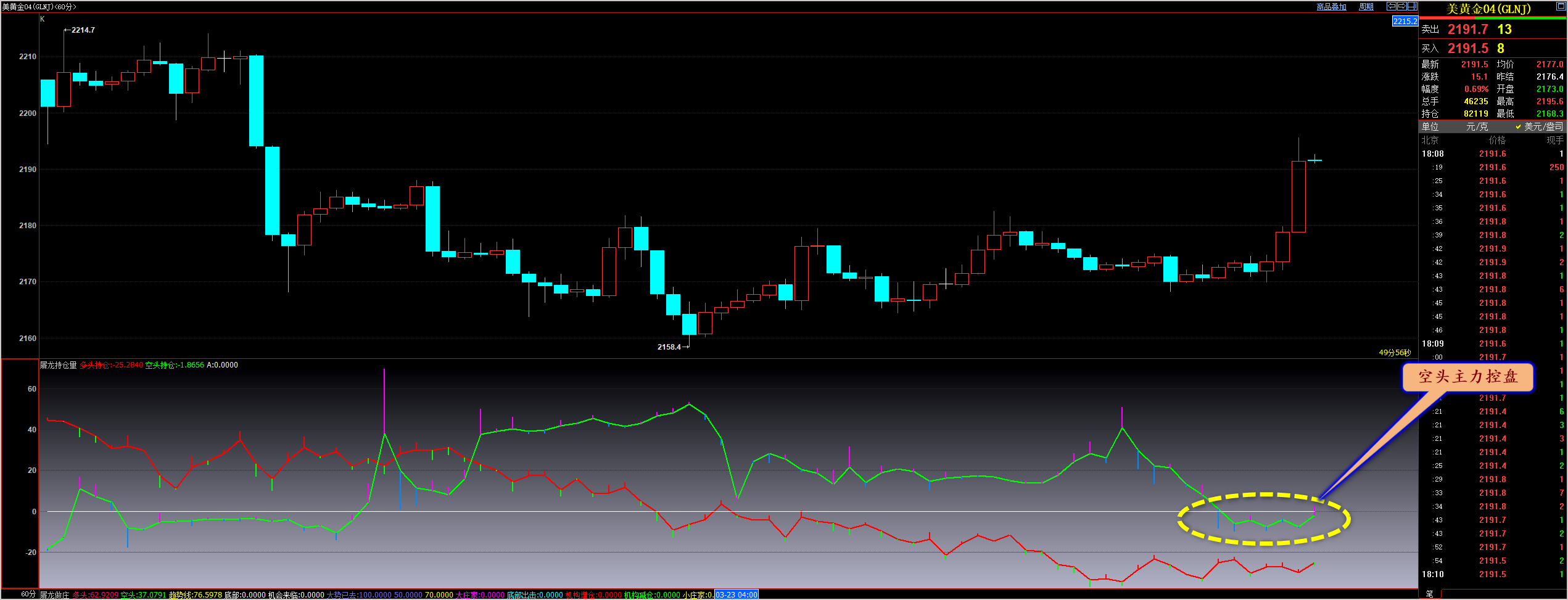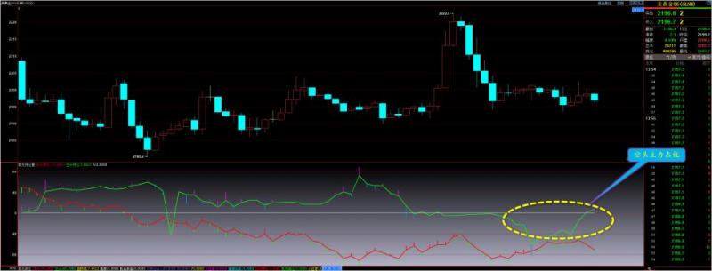 通过对黄金小时图解析得知,昨日行情先跌后涨晚间在到达上方2198一线冲高回落,我们从下方的附图可以清楚的看到多头主力一直是处于增仓的状态但是到目前为止还没有占优依然是空头主力主导,短期下方我们重点关注下方上升趋势线的支撑,一旦跌破将会继续加速下跌,近几日是黄金交割期行情出现异常属于正常情况,在操作上