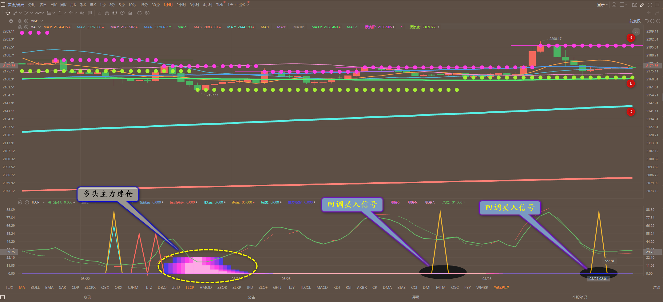 通过对黄金小时图解析得知,昨日行情先涨后跌到达上方2200一线冲高回落晚间再次回到下方2170一线的均线支撑位,我们从下方的附图可以清楚的看到在前期2157一线出现了多头主力建仓信号,在上上一个交易日2170一线出现了回调买入信号,都出现了不错的反弹动作,今日早盘再次出现回调买入信号预计将会继续向上反弹,短期下
