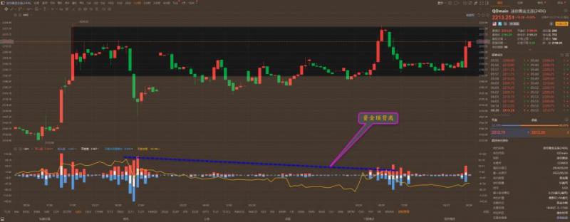 通过对黄金小时图解析得知,黄金从早盘到目前为止继续向上攻击,早盘就已经说过了这两天交割期容易出现无厘头的行情,短期我们可以清楚的看到近期行情一直在高位宽幅震荡运行,我们从下方的附图可以清楚的看到整体市场资金流呈现流出迹象行情在高位形成了资金顶背离迹象,非常有可能再次冲高回落短期上方我们重点关注219