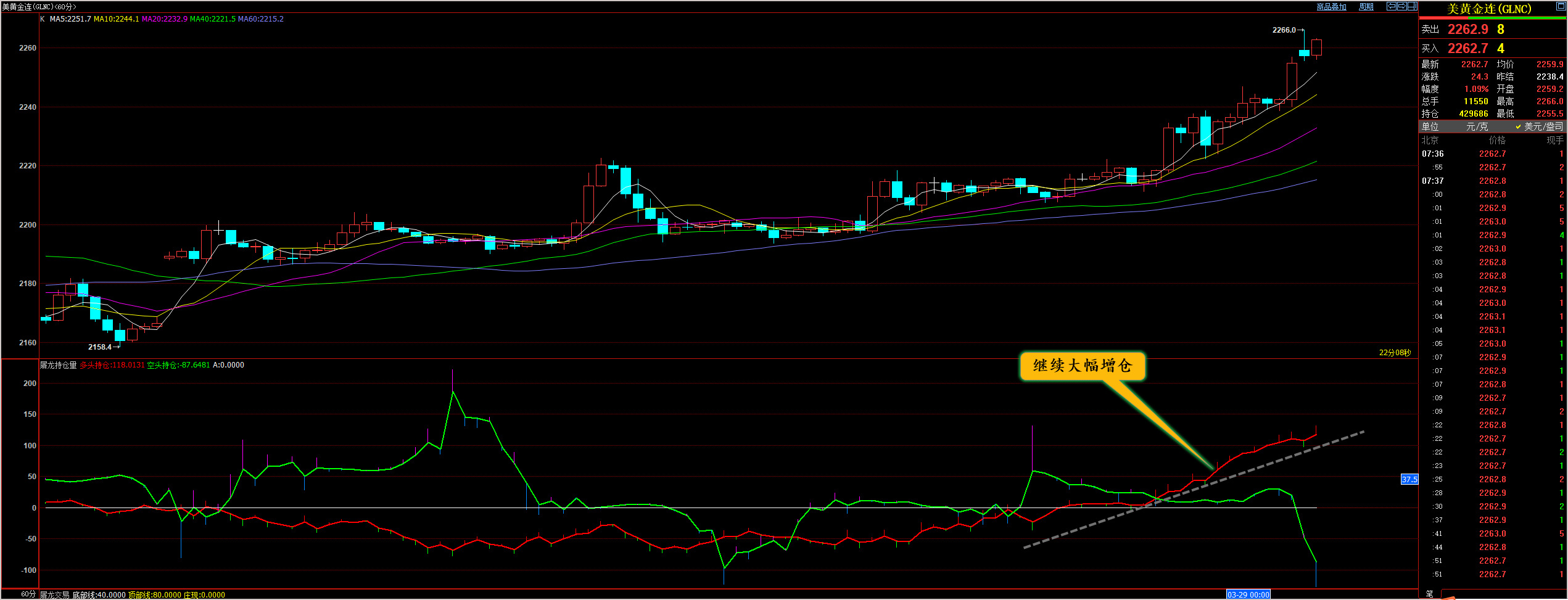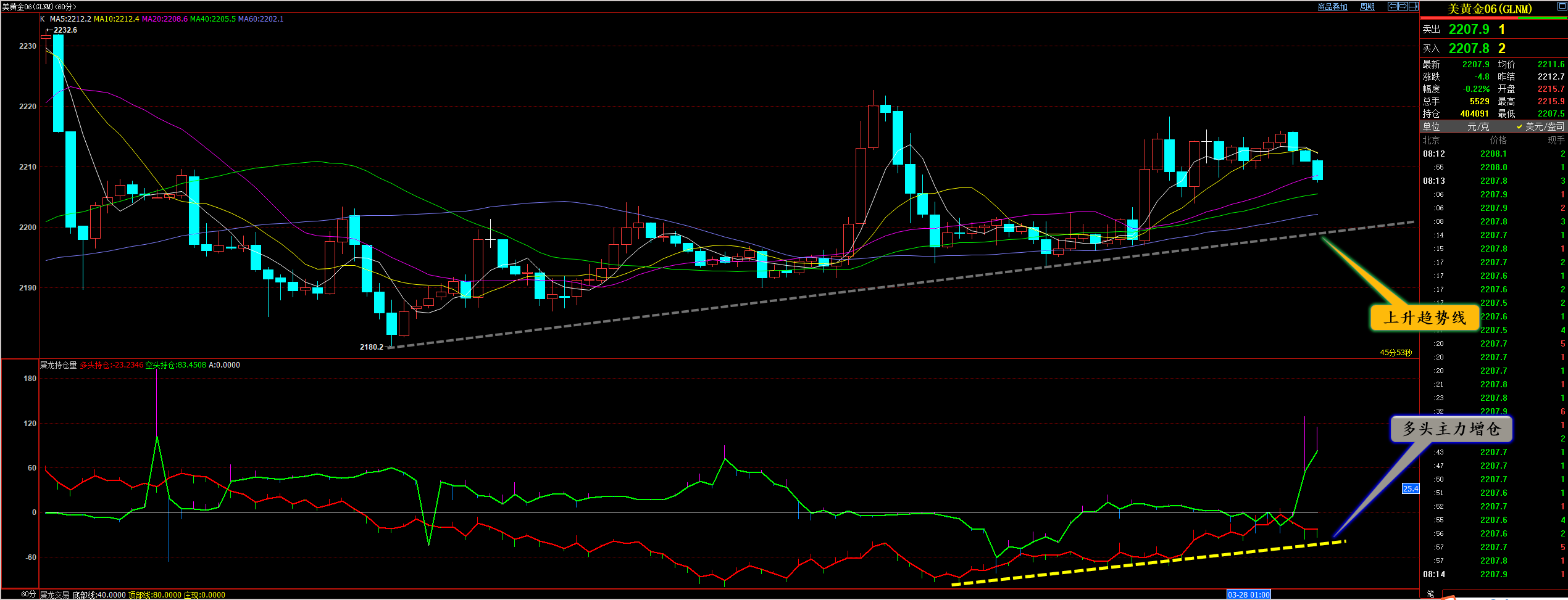 通过对黄金小时图解析得知,上一个交易日如期放量突破上方的2212和223的压力,我们的目标位2246已经到达,行情之所以会接二连三的有效突破上方的阻力位,我们从下方的附图就可以清楚的看到,多头主力上周五下午持续增仓并且已经大于空头主力的持仓量,晚间加速增仓到目前为止一直是处于增仓的状态上周五就已经说过一旦突