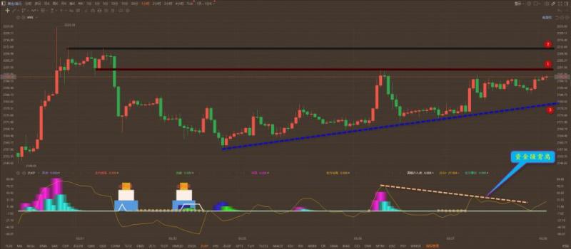 通过对黄金小时图解析得知,黄金从早盘到啊目前为止继续向上反弹,即将到达前期的反弹高点2199一线(1号压力位),我们从下方的附图可以清楚的看到目前已经出现资金顶背离迹象,但是不排除进一步向上攻击到达上方2号压力位,短期下方我们重点关注3号趋势线的支撑2182一线的样子,短期在操作上我们继续高空低多思路,具体