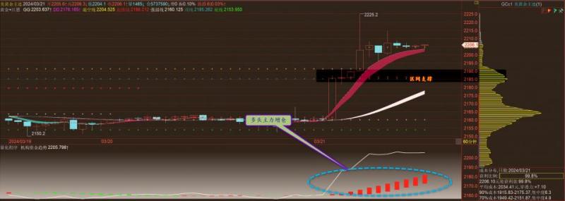 通过对黄金小时图解析得知,黄金从早盘先涨后跌在上方2223一线受阻回落在下方2192一线止跌反弹上涨目前运行在2205一线,昨日晚间一口气放量突破上方2188一线的压力位,我们从右侧的筹码峰值来看下方2180-2188这个前期的压力区间目前已经反过来成为短期强有力的支撑,我们从下方的附图也可以清楚的看到多头主力持续流入,