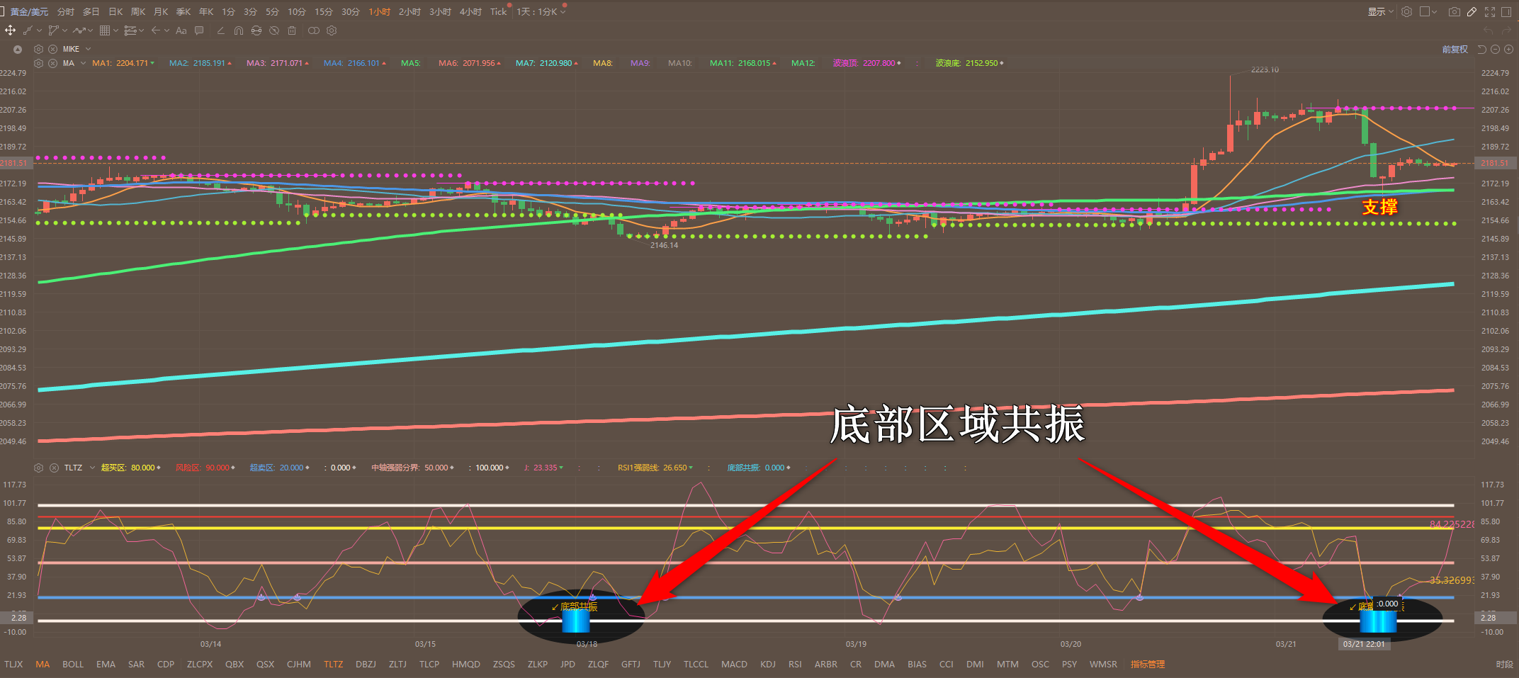 通过对黄金小时图解析得知,昨日行情先涨后跌,晚间一度到达下方2168一线把上一个交易日的涨幅全部收复失地,目前在2180一线震荡徘徊,我们从下方的附图可以清楚地看到昨日晚间在下方2168一线再次出现底部共振信号,在前期2147一线出现共振信号行情大幅拉升了一波,昨日晚间再次出现预计将会继续上行突破创新高上方我们