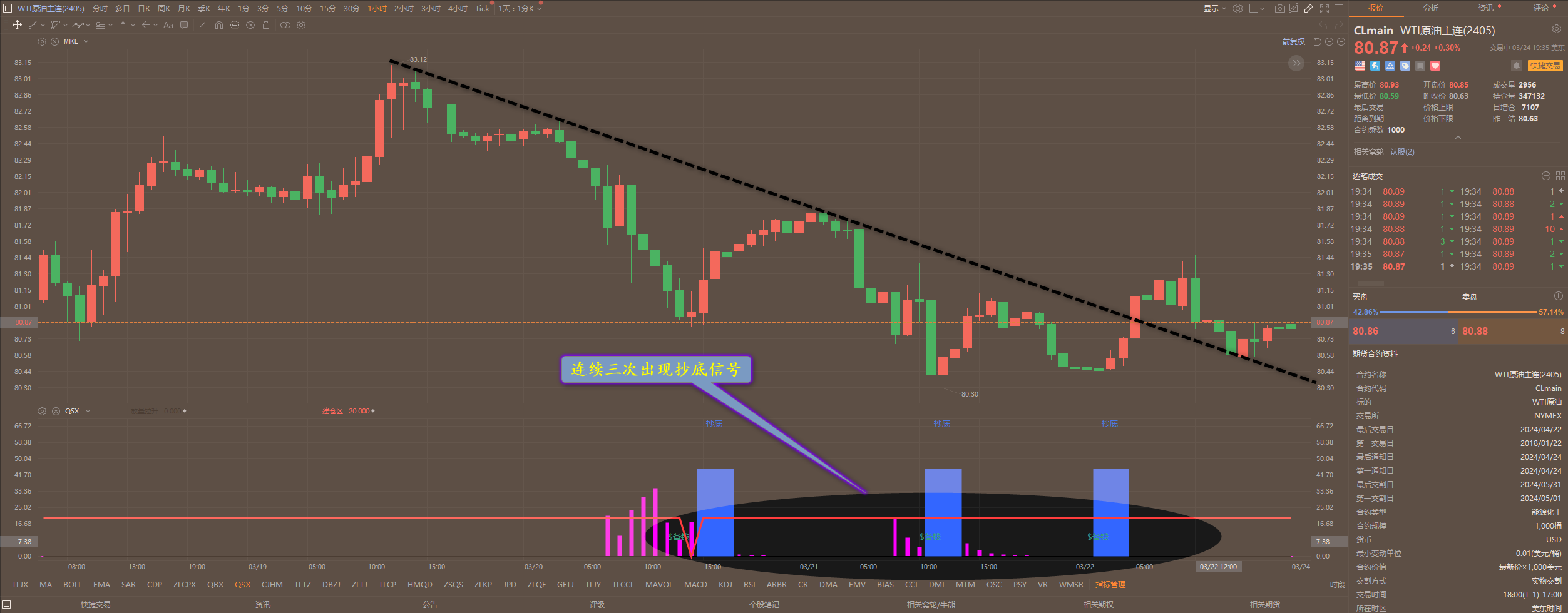 通过对原油小时图解析得知,昨日行情先跌后涨晚间到达下方80.80一线再次止跌反弹上涨,行情之所以会出现止跌反弹上涨我们从下方的附图可以清楚的看到昨日在80.80一线再次出现底部区域超级主力抄底信号,上一次是在76.80一线出现抄底动作,行情一路上攻到83.10一线,昨日晚间再次出现预计也要突破创新高,目前就看上涨的