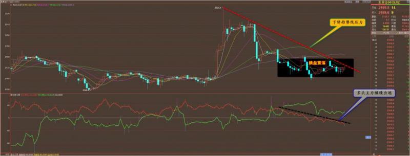 通过对黄金小时图解析得知,黄金早盘先涨后跌到达上方下降趋势线的压力位受阻回落,我们从下方的附图可以清楚的看到从星期五到目前为止横盘震荡期间而我们的多头主力最近一直是处于大量出逃的状态,说明这两天行情还要继续向下运行,短期下方我们重点关注2147和2132一线的支撑,短期在操作上我们继续重点逢高做空,具体