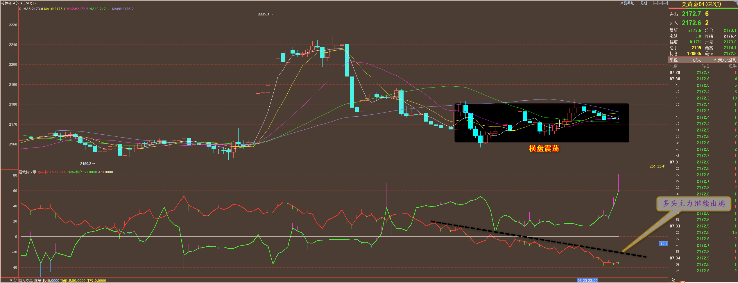 通过对黄金小时图解析得知,昨日行情如期窄幅震荡调整运行,在上方2181一线依然受到压制,之所以会出现上攻无力的动作,我们从下方的附图可以清楚的看到连续两个交易日在横盘震荡调整期间多头主力一直是处于出逃的状态并且空头主力已经处于高度控盘的状态说明短期行情还要继续向下运行跌破上周五的低点的可能性比较大,