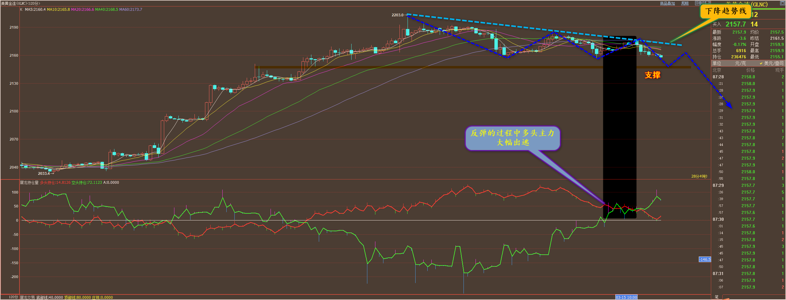 通过对黄金2小时图解析得知,上一个交易日,行情如期反弹到上方下降趋势线2171一线冲高回落,在上一个交易日当中就已经说过短期已经形成下跌趋势,我们从下方的幅图也可以清楚的看到在上一个交易日反弹的过程中多头主力继续大幅出逃,空头主力继续大幅增仓短期并且已经处于高度控盘的状态短期有进一步下探的动作,短期我