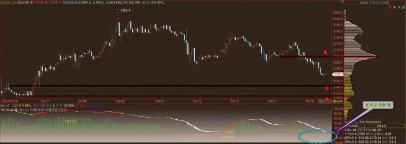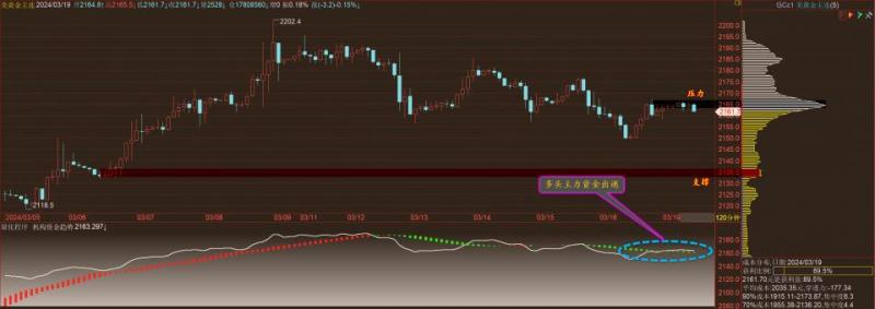 通过对黄金2小时图解析得知,黄金从早盘连续冲高2163未果,正如我们正如所说已经到达上方筹码峰值的压力位,我们从下方的附图也可以清楚地看到多头主力资金一直是处于出逃的状态,早盘研报也已经告知是空头主力出逃导致行情的反弹属于被动式反弹,短期行情大方向下跌不变下方我们重点关注2124一线的支撑一旦破位将会继续