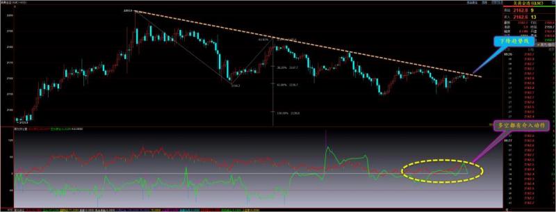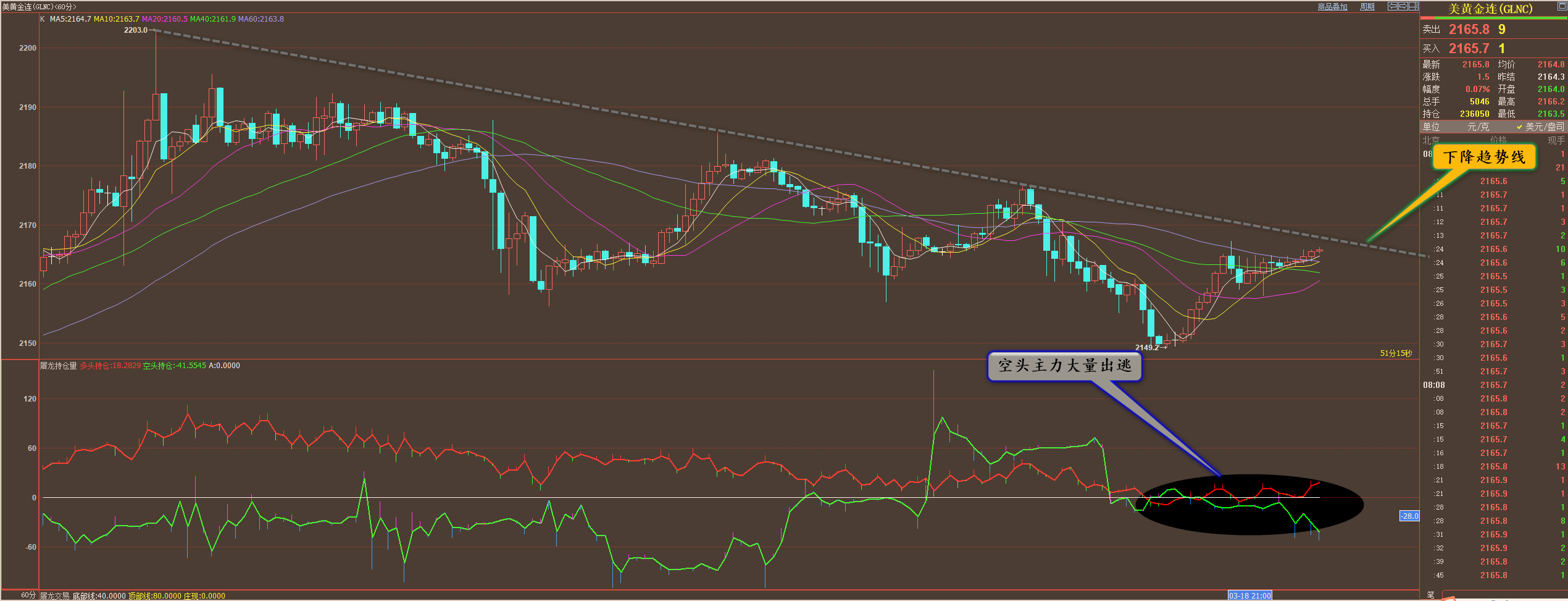 通过对黄金小时图解析得知,昨日行情先跌后涨在盘中形成窄幅震荡调整走势,从主图中可以清楚地看到早盘再次到达上方下降趋势线的压力位(2160一线),我们从下方的附图也可以清楚的看到行情之所以会出现窄幅震荡调整走势连续2个交易日出现了多空都有增仓动作,但是短期依然实在下降趋势当中运行,整体依然偏弱走势,短期
